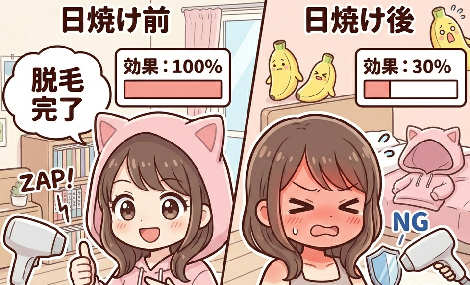 理由はシンプルで、日焼けした肌はメラニンが増え、レーザーが毛だけでなく肌にも反応しやすくなるからです。