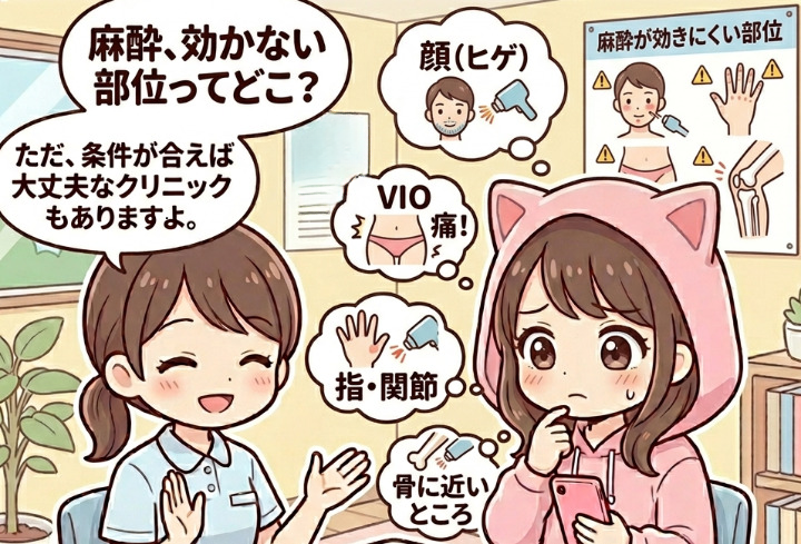 - 髭・VIO・ワキ・骨に近い部位は、麻酔しても痛みが残りやすい