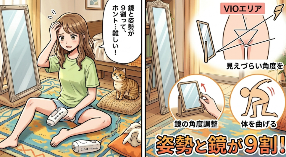 むしろ、VIOセルフ脱毛で失敗する人の多くは、脱毛器の性能より“姿勢・鏡・見え方”の準備不足でつまずいています。