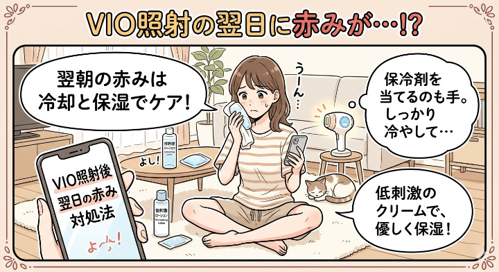VIO照射の翌日に赤みが出る原因、何日まで様子見していいか、赤い斑点や赤いぶつぶつの見分け方、今すぐやるべき対処法、次回以降に失敗しない家庭用脱毛器の選び方まで、最初から最後まで分かるように解説します。