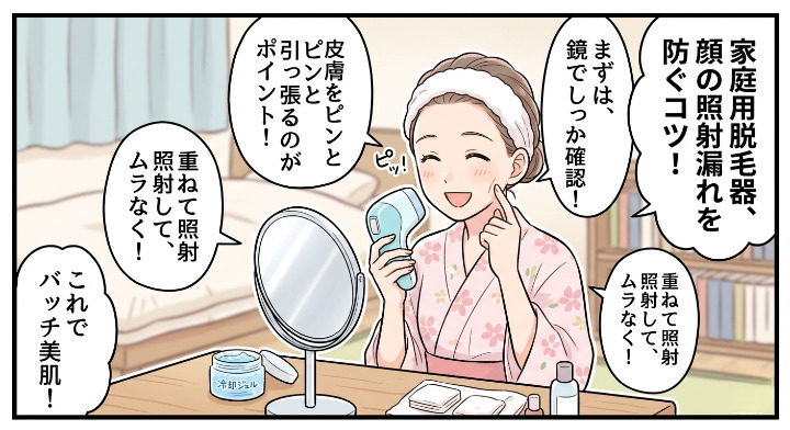 この記事では、家庭用脱毛器で顔脱毛をするときに照射漏れが起きる原因、正しいやり方、口周りのコツ、失敗しない頻度まで、迷わず実践できる形でまとめます。
