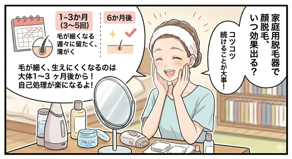 この記事では、家庭用脱毛器で顔脱毛したときの効果が出るまでの期間、何回目で変化を感じるか、正しい頻度、メンズのヒゲや濃い毛との違い、やってはいけない失敗まで、迷わず判断できる形でまとめます。