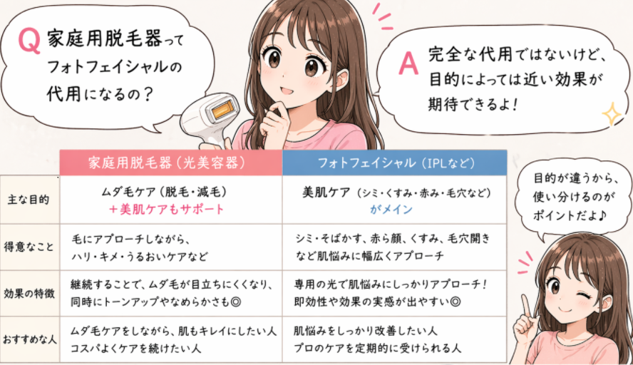 家庭用脱毛器は“フォトフェイシャルの代わり”ではなく、“脱毛メインで肌印象も少し整える道具”です。