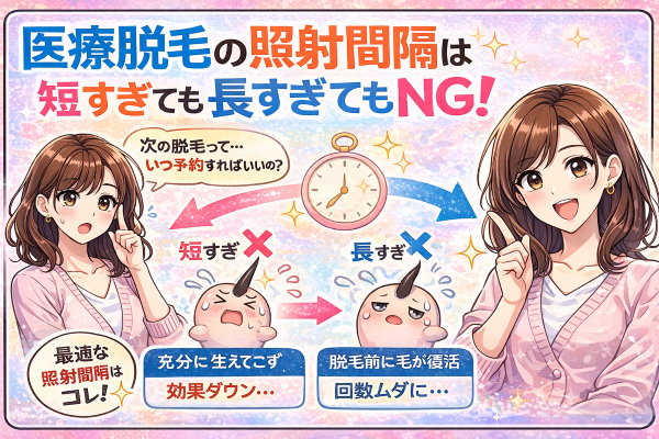 成長期の毛がまだ揃っていない段階でレーザーを照射しても、反応する毛が少ないため1回の施術効果が大幅に下がります。「早く終わらせたいから1ヶ月で通う」は、逆に遠回りになることが多いのです。